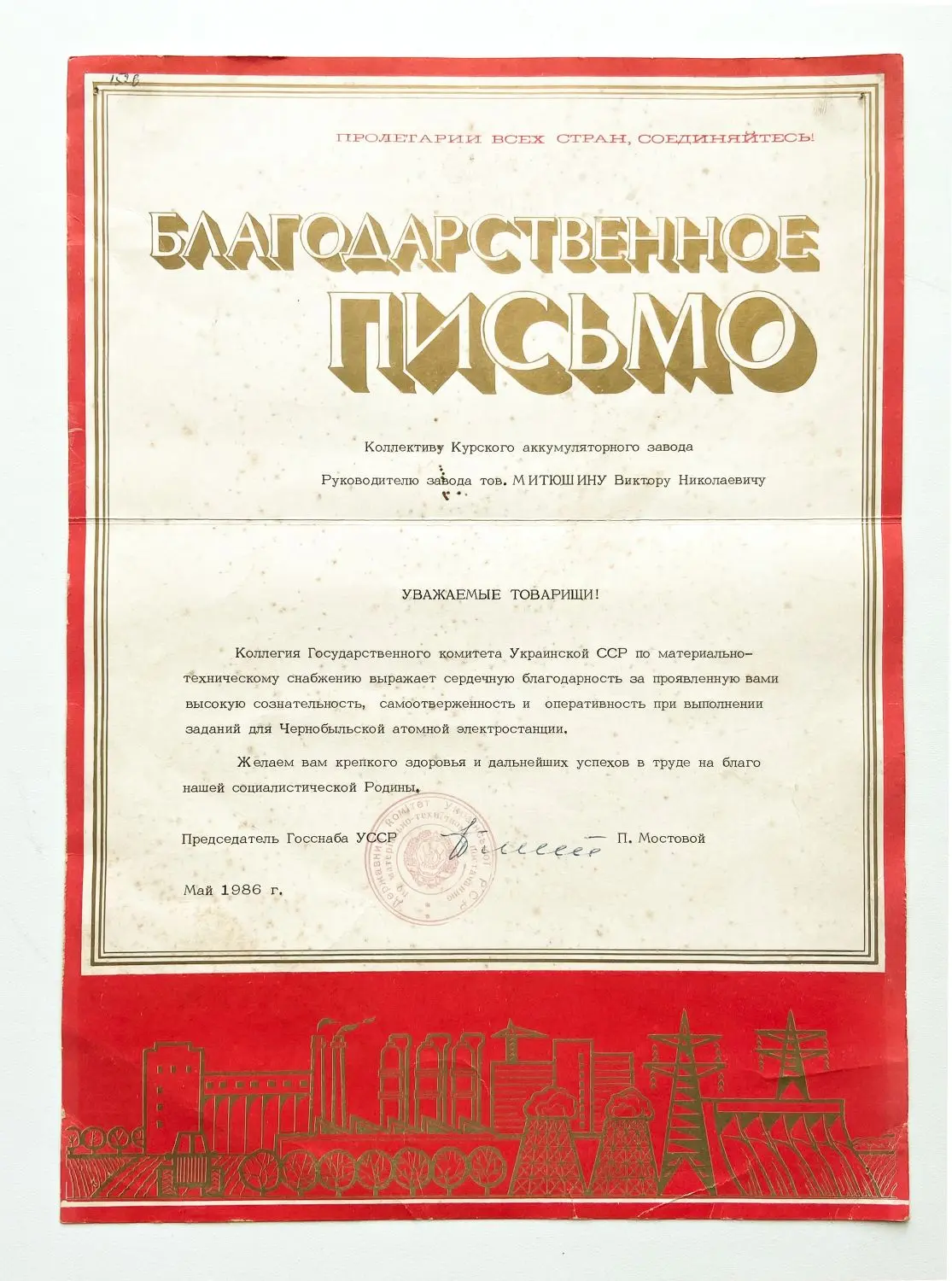 На заводе хранится благодарственное письмо, датированное маем 1986 года, за участие в ликвидации последствий аварии на Чернобыльской АЭС. Это письмо – не музейный экспонат, а память о героизме ликвидаторов.