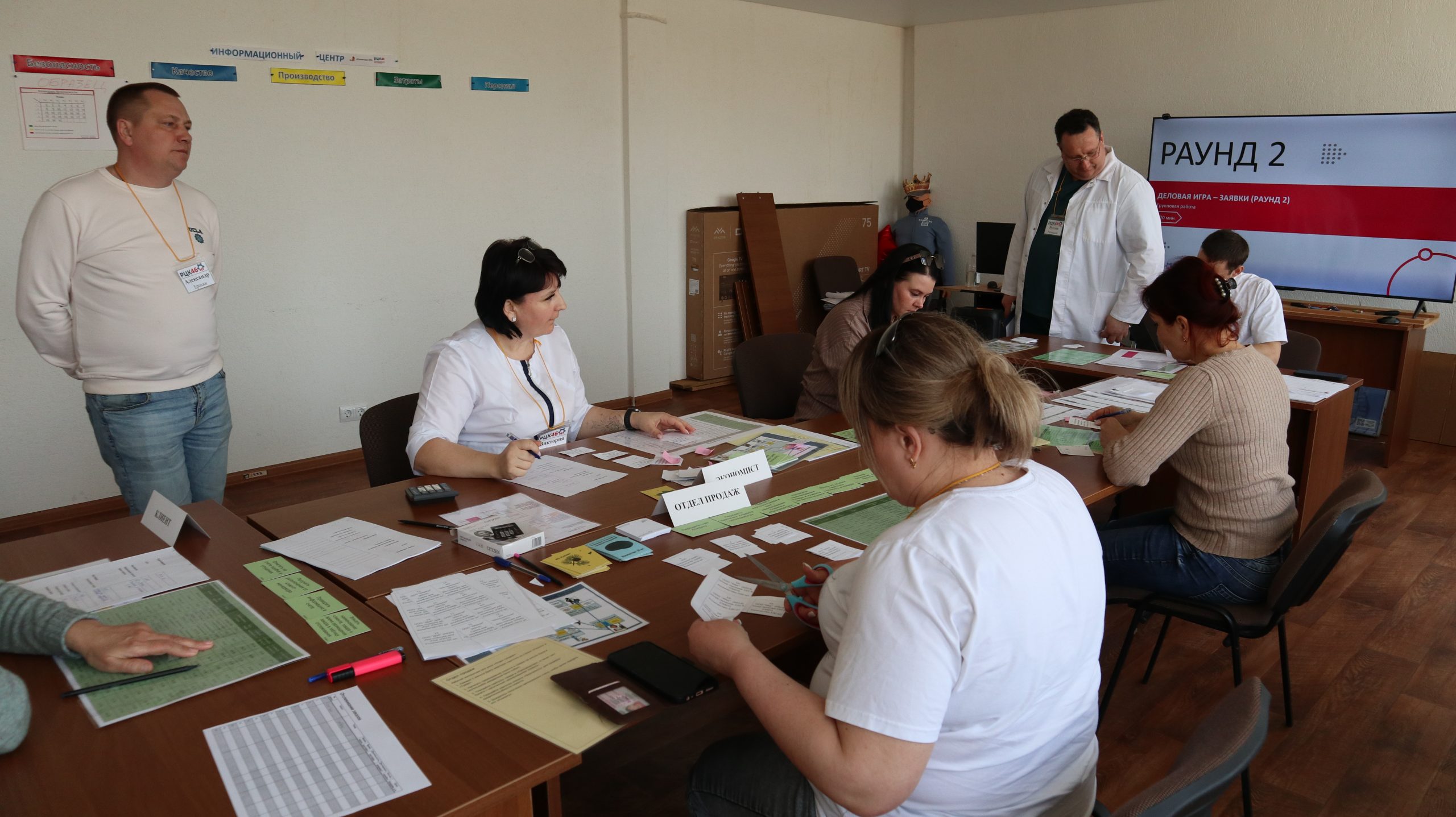 В течение одного дня сотрудники предприятия были вовлечены в три раунда деловой игры «Эффективный офис», направленные на оптимизацию процессов принятия решений, ускорение выполнения задач и снижение издержек, что способствовало повышению прибыльности и эффективности работы предприятия. В первом раунде участникам не удалось успешно выполнить задание из-за трудностей, типичных для реальных офисных процессов, а также задач, специально введенных организаторами для демонстрации существующих проблем. Перед вторым раундом на инфоцентре было проведено обсуждение выявленных недостатков: нерационального размещения, избыточности информации, подготовки ненужных документов и отчетов, а также незамеченных ошибок и просчетов в оформлении, требующих доработки. После изучения инструментов бережливого производства участники идентифицировали слабые места и разработали меры по их устранению. Также было проведено рациональное распределение обязанностей и оптимизация рабочей зоны с применением методологии 5С. Во втором раунде, после внедрения улучшений, план был выполнен почти полностью, но требовалось доработать процесс. В третьем раунде, после дополнительных улучшений, команда успешно справилась с поставленной задачей.
