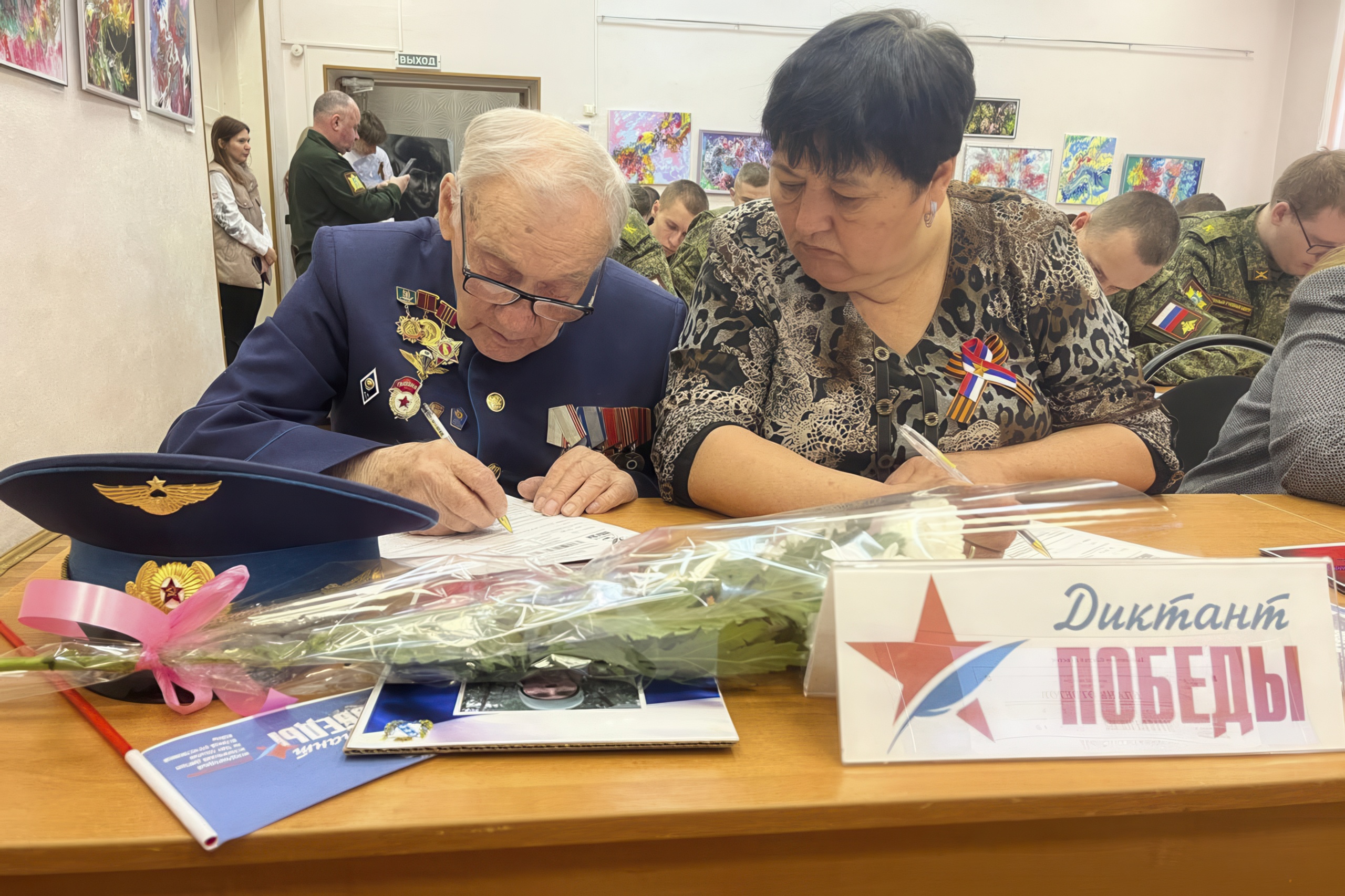 А на площадку в библиотеке имени Семёнова многие участники «Диктанта Победы» пришли с портретами своих близких – участников «Бессмертного полка», героев Великой Отечественной войны, бойцов СВО. Здесь за одной партой со студентами и волонтёрами – ветеран Виктор Шатохин. Виктору Григорьевичу 95 лет, он старейший участник акции в Курске. Когда началась война, ему было 12 лет. Он пережил ужасы оккупации, а после войны исполнил мечту погибшего брата – стал лётчиком.